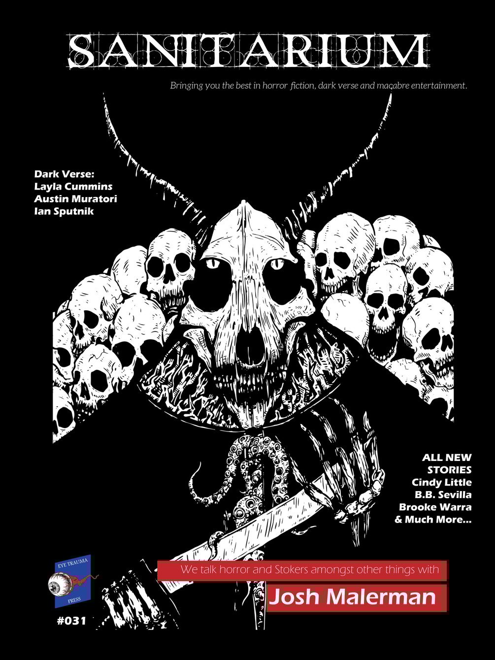 Within Sanitarium (Horror Fiction and Dark Verse) Magazine Issue 31 you will find 8 Stories, 3 Dark Verse, Top 10, Group Therapy & Interviews